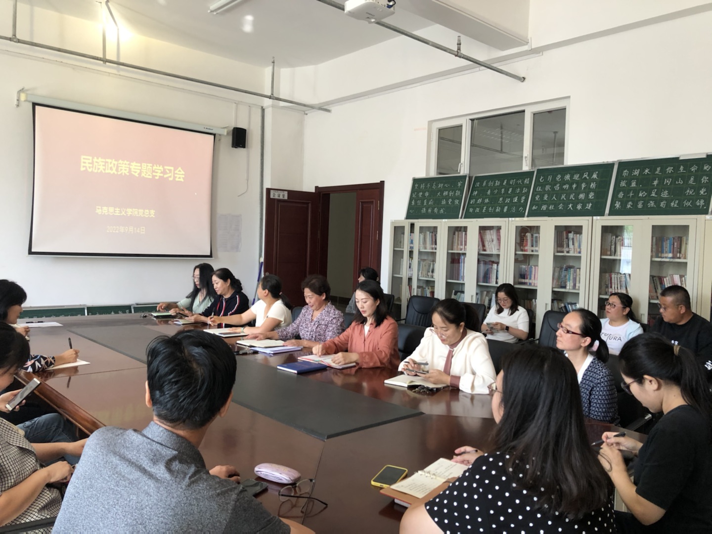 為深入開展鑄牢中華民族共同體意識教育,促進民族團結(jié)進步,9月14日,馬克思主義學院黨總支理論學習中心組擴大學習會在崇文樓B123會議室召開專題學習。會議由黨總支書記劉鳳琴主持,學院全體教師參加。會上集中學習了《內(nèi)蒙古自治區(qū)促進民族團結(jié)進步條例》、《內(nèi)蒙古自治區(qū)教育條例》和《中華人民共和國國家通用語言文字法》等法律法規(guī),同時要求各位老師自學《民族區(qū)域自治法》。