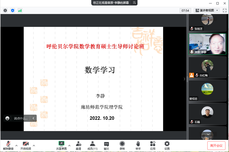10月20日下午,數(shù)學(xué)與統(tǒng)計(jì)學(xué)院邀請(qǐng)廊坊師范學(xué)院李靜教授(數(shù)學(xué)與統(tǒng)計(jì)學(xué)院客座教授)為教育碩士學(xué)科教學(xué)(數(shù)學(xué))方向《課程與教學(xué)論》課程授課團(tuán)隊(duì)集體學(xué)習(xí)研討班開(kāi)展第四講講座,講座采用線上方式進(jìn)行。