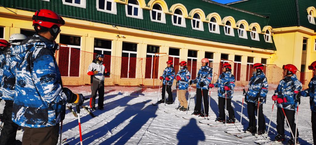 滑雪課因授課學生較多,分5批陸續進行。本次滑雪課程由4名教師帶領2020級4個教學班77名學生進行為期10天的單板和雙板兩個項目的學習。學生從滑雪服套裝和頭盔的穿戴、專項的準備活動、滑雪技能分階段的教學進行學習。學生精神狀態飽滿、上課積極性高漲,教學效果良好。