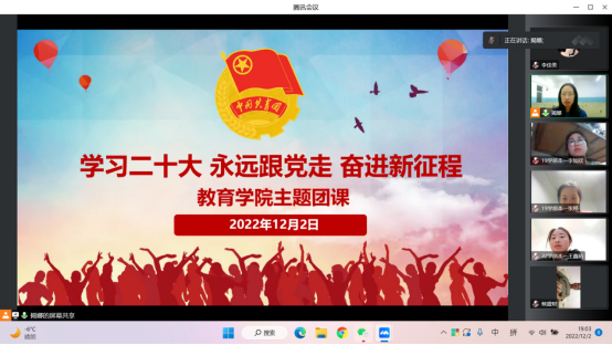 為進一步引領學生深刻領悟黨的二十大精神的豐富內涵,12月2日下午,教育學院組織開展了學習黨的二十大報告主題團課。本次活動在線上開展,教師揭娜擔任主講,學院全體學生干部、團干部以及青馬班學員參加了本次學習。