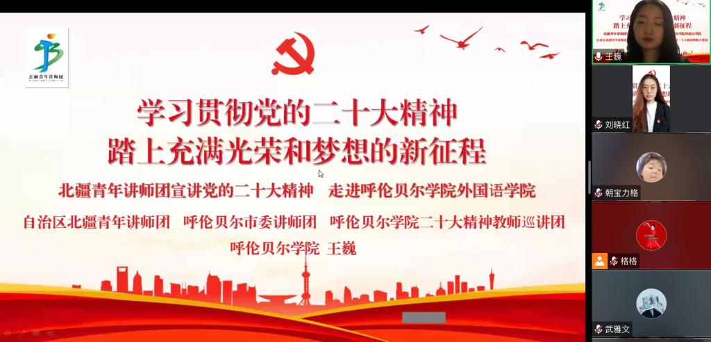 為全面深入學習貫徹黨的二十大精神,12月8日,外國語學院黨總支在線上開展黨的二十大精神宣講活動,活動邀請呼倫貝爾學院學習貫徹黨的二十大精神校園巡講團成員、外國語學院團學辦公室副主任王巍為學院師生宣講黨的二十大精神。學院領導班子成員、全體教職工、全體學生黨員及青馬班成員等150余人參加。活動由學院黨總支書記金鑫鑫主持。