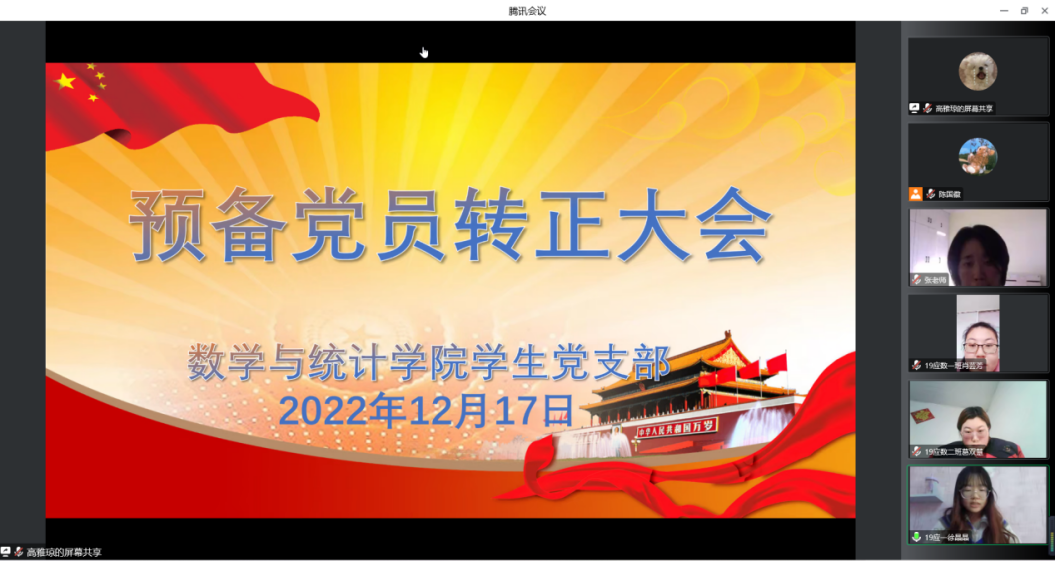 12月17日,數(shù)學(xué)與統(tǒng)計(jì)學(xué)院學(xué)生黨支部線上舉行預(yù)備黨員轉(zhuǎn)正大會(huì),會(huì)議由學(xué)生黨支部書記張娟主持,支部全體黨員參加了會(huì)議。