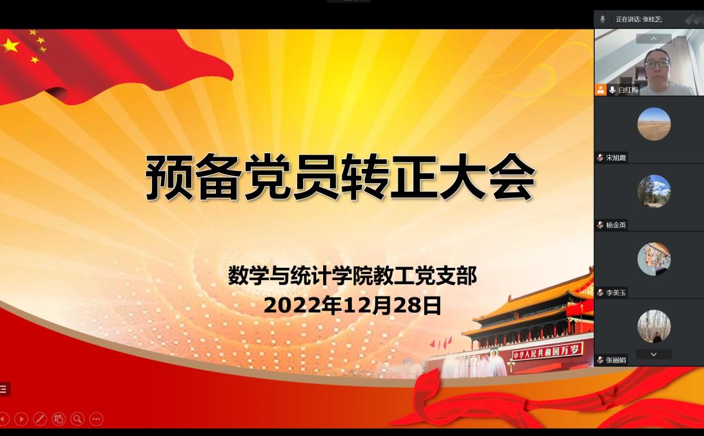 12月28日,數學與統計學院教工黨支部在線上召開全體黨員大會,審議、討論、表決預備黨員轉正事宜。會議由教工黨支部書記白紅梅主持,支部全體黨員參加此次會議。