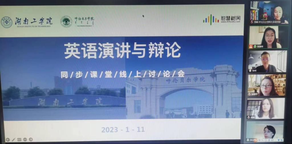 為了更好地推進國家外語專業“三進教材”課程的建設與發展,在“慕課西行2.0”項目的支持下,1月11日下午,呼倫貝爾學院外國語學院與湖南工學院外國語學院在線上召開“英語演講與辯論”同步課堂研討會。湖南工學院的副校長、外國語學院院長柳星,我校外國語學院副院長姜麗杰參加了會議。會議由“智慧樹”平臺的工作人員主持。