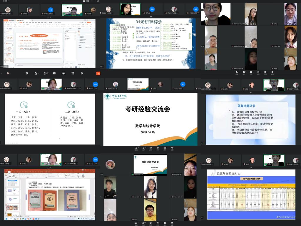 為幫助考研學子明確考研目標、鼓舞考研斗志,掌握學習方法與技巧,做好考研復習規劃,4月15日晚,數學與統計學院舉辦線上考研經驗交流會,邀請2018級、2019級4名畢業生分享考研成功經驗和心得體會。會議由數學與應用數學系主任吳紅艷主持,百余名學生參加了交流會。