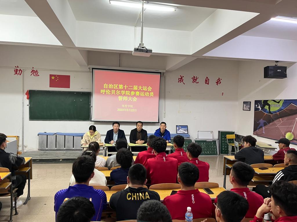 5月22日下午,自治區第十二屆大學生運動會呼倫貝爾學院參賽運動員誓師大會在體育學院山下體育館二樓多媒體教室舉行。學院黨總支書記胡日查、院長李曉峰、相關科室負責人、各運動隊教練員及運動員70余人參會。