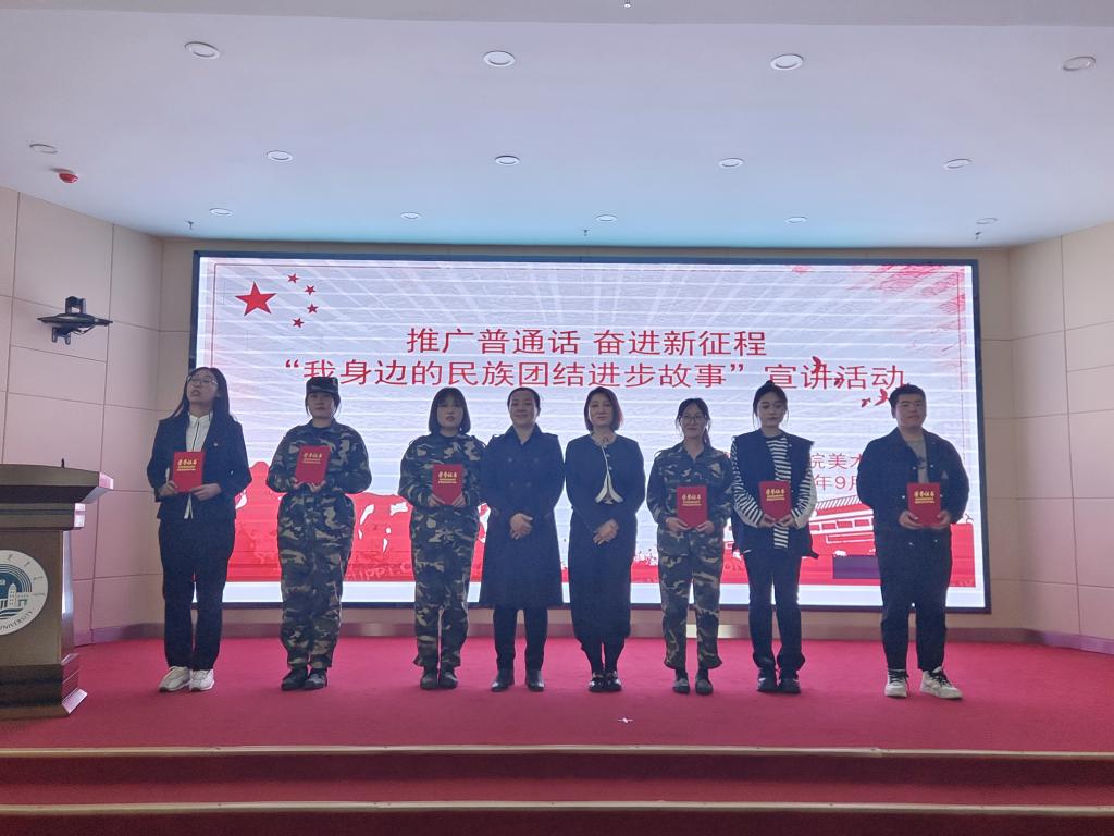 為推進鑄牢中華民族共同體意識宣傳教育工作,全面推進中華民族共有精神家園建設(shè),推廣普及國家通用語言文字,9月23日,美術(shù)學(xué)院開展“我身邊的民族團結(jié)故事”宣講活動。黨總支副書記張巍巍、團總支書記張健參加活動。