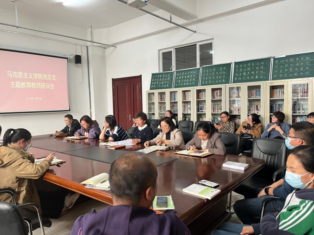 為推動學習貫徹習近平新時代中國特色社會主義思想主題教育走深走實,推動全體黨員當好貫徹落實習近平新時代中國特色社會主義思想的執行者、行動派、實干家,10月18日下午,馬克思主義學院黨總支在崇文樓B123會議室召開主題教育教師座談會,學院全體教師參加會議。