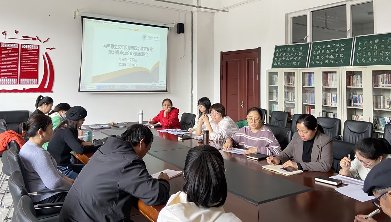 為進(jìn)一步推進(jìn)2024屆本科畢業(yè)生畢業(yè)論文工作,提高畢業(yè)論文選題質(zhì)量,確保學(xué)生畢業(yè)論文高質(zhì)量完成,10月21日上午,馬克思主義學(xué)院在崇文樓B123會議室組織召開了2024屆思想政治教育專業(yè)本科畢業(yè)論文選題論證會,思想政治教育專業(yè)全體論文指導(dǎo)教師參加了本次會議。
