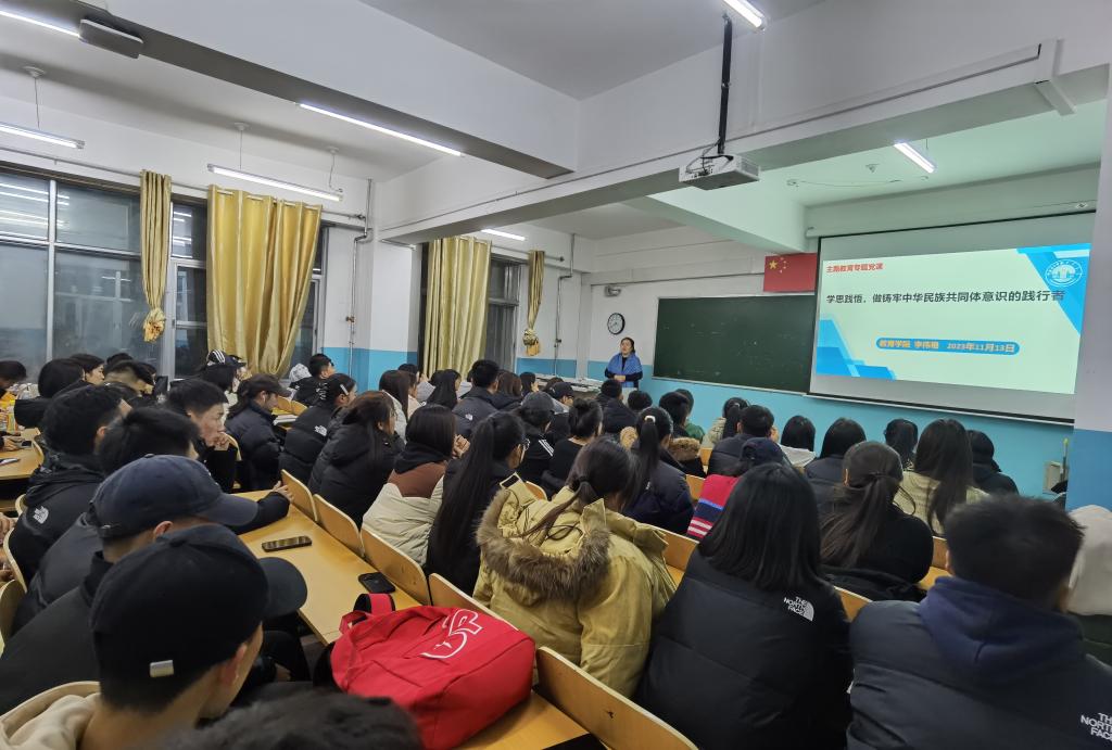 為深入學(xué)習(xí)宣傳貫徹《關(guān)于全面深入持久開(kāi)展民族團(tuán)結(jié)進(jìn)步創(chuàng)建工作鑄牢中華民族共同體意識(shí)的意見(jiàn)》精神,推動(dòng)主題教育走深走實(shí),鑄牢中華民族共同體意識(shí)教育,幫助2023級(jí)少數(shù)民族預(yù)科班學(xué)生合理規(guī)劃學(xué)業(yè),順利實(shí)現(xiàn)轉(zhuǎn)段,11月13日,教育學(xué)院院長(zhǎng)李偉艷面向2023級(jí)全體少數(shù)民族預(yù)科專(zhuān)業(yè)學(xué)生講授《學(xué)思踐悟,做鑄牢中華民族共同體意識(shí)的踐行者》專(zhuān)題黨課。學(xué)院黨總支副書(shū)記、輔導(dǎo)員、2023級(jí)全體少數(shù)民族預(yù)科專(zhuān)業(yè)學(xué)生參加學(xué)習(xí)。