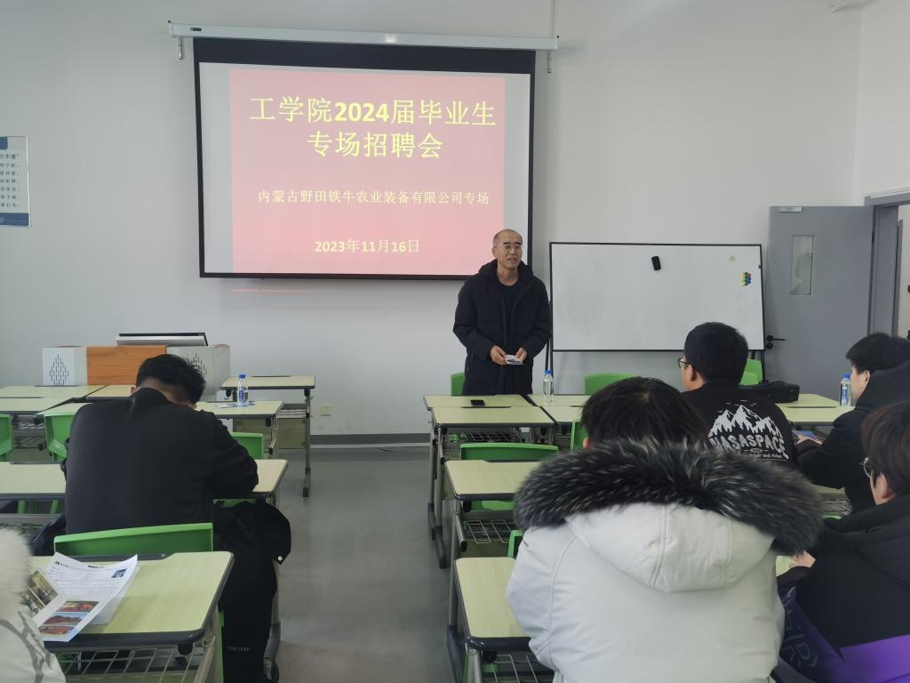 為進(jìn)一步做好2024屆畢業(yè)生就業(yè)工作,11月16日下午,工學(xué)院邀請內(nèi)蒙古野田鐵牛農(nóng)業(yè)裝備有限公司在東山實(shí)訓(xùn)樓C521教室舉辦專場招聘宣講會(huì)。會(huì)議由學(xué)院黨總支副書記吳晗主持,2024屆畢業(yè)生30余人參加了此次招聘會(huì)。