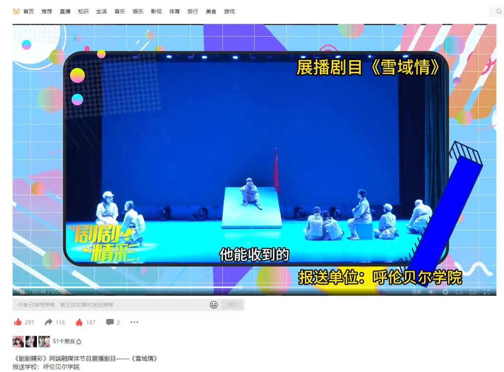 近日,文學院話劇團選送課本劇《雪域情》參加全區優秀課本劇評比,在300多部作品中脫穎而出,以前50名的優異成績成功在內蒙古電視臺奔騰融媒上進行精彩展播。全劇由文學院學生參與出演,歷時兩個多月,以最精湛的舞臺演繹和最動人的精神內核,通過描寫一段五十多年前的進藏歷史,展現雪域高原瑰麗奇異的自然風光,發生在遙遠的進藏女兵身上純真而動人的愛情圣歌,構成了色彩斑斕的畫面和震撼人心的故事。