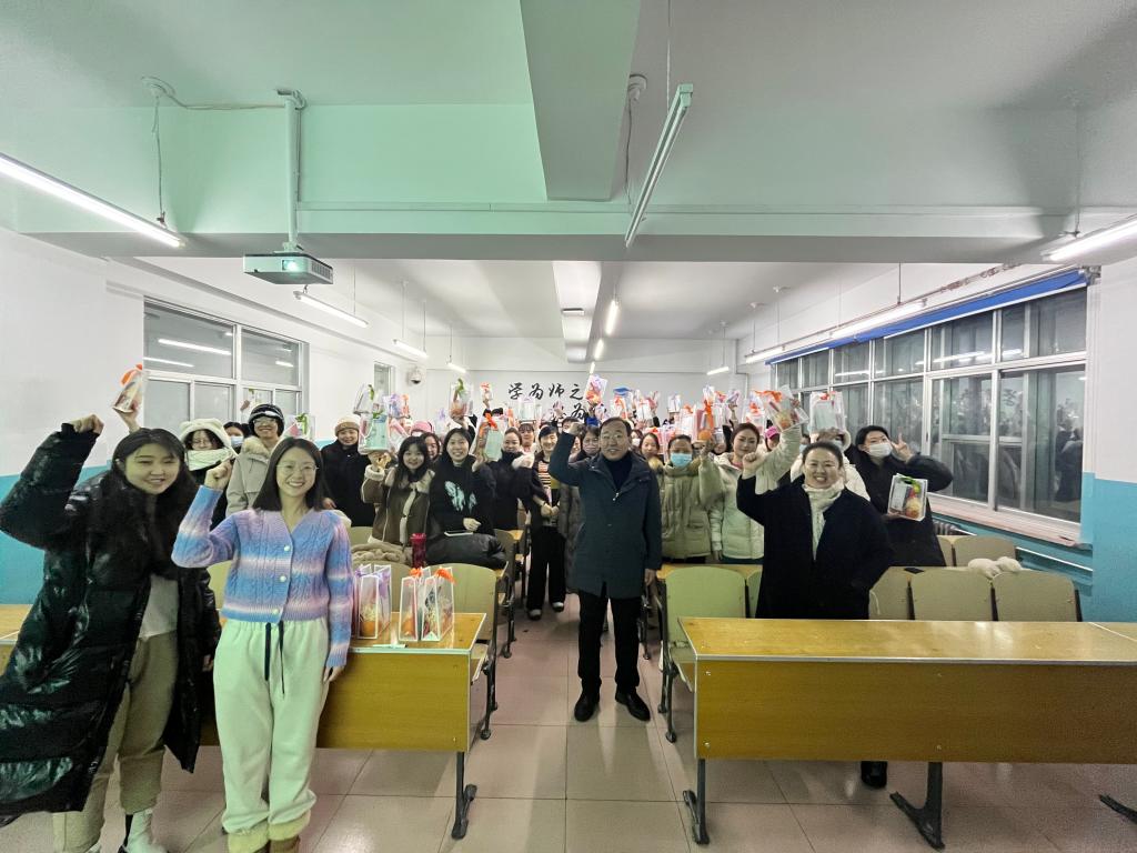 在愉快的氛圍中,教師們給考研學子送上一件件精美的禮物,一句句暖心的叮囑。“前程似錦”的祝福信、“驅散嚴寒”的暖寶寶、心想事“橙”的橙子、“一旺到底”的旺仔牛奶……這些禮物寄托了教師們的關愛,傳遞了教師們對考研學子沉甸甸的祝福。