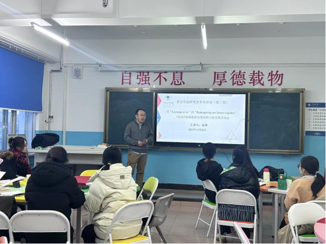 活動中,包鋒為學生們介紹了一些OECD、UNESCO等組織,并為大家分享了聯(lián)合國教科文組織發(fā)表的四份教育報告:《學會生存——教育世界的今天和明天》《教育——財富蘊藏其中》《反思教育:向“全球共同利益”的理念轉(zhuǎn)變?》和《一起重新構(gòu)想我們的未來:為教育打造新的社會契約》,同時緊扣教育報告內(nèi)容為大家介紹了高質(zhì)量期刊文章。他希望學生們廣泛閱讀各類書籍、文獻,學會發(fā)現(xiàn)問題。