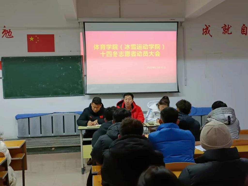 為確保第十四屆全國冬季運動會志愿者工作有序開展,充分調動志愿者的積極性,提高志愿者的服務能力,體育學院(冰雪運動學院)于12月31日在體育館二樓多媒體教室召開“十四冬”志愿者動員大會。學院黨總支書記胡日查、副書記凌占一及學院全體志愿者參加動員大會。會議由團學辦主任卜祥云主持。