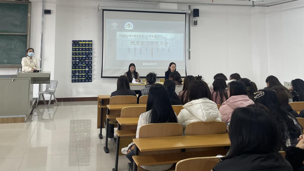 3月11日下午,蒙古學學院在崇文樓B401教室舉行了畢業生實習動員大會暨就業工作推進會。學院黨總支書記格根塔娜、副書記孔春艷、副院長小花、實驗實訓中心主任烏云斯琴及2024屆畢業生參會。