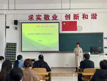 為深入學習貫徹習近平總書記考察內蒙古時的重要指示精神,結合內蒙古自治區黨委在全區開展“感黨恩、聽黨話、跟黨走”群眾教育實踐活動安排,3月27日下午,蒙古學學院科普基地在崇文樓B209室開展了以“感黨恩、聽黨話、跟黨走”——黨的關懷下的蒙古文信息化發展現狀為主題的科普知識講座。講座主講人為學院教師包艷花教授。中國少數民族語言文學系主任包薩如拉主持講座,100余名師生參加。