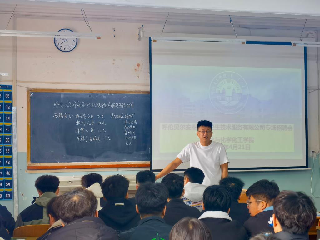 為了給2024屆畢業生提供更廣闊的就業平臺,進一步拓寬就業渠道,礦業與化學化工學院邀請呼倫貝爾市安泰職業衛生技術服務有限公司和內蒙古宜化化工有限公司于4月21日上午在工程樓415教室聯合召開了專場招聘會。學院黨總支副書記敖巖輝,輔導員孟慶永、龐明慧及2024屆在校畢業生參會。