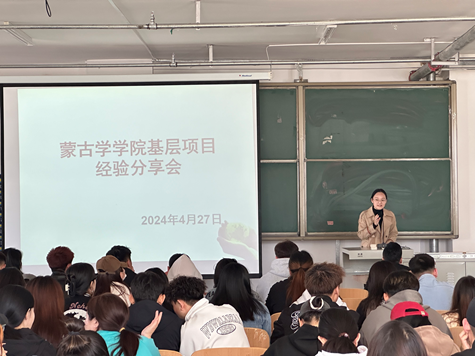 為持續(xù)做好2024屆畢業(yè)生就業(yè)工作,拓寬就業(yè)渠道,幫助大學(xué)生樹(shù)立正確的就業(yè)觀念,鼓勵(lì)更多的優(yōu)秀畢業(yè)生積極投身西部志愿服務(wù)、走向基層干事創(chuàng)業(yè),4月27日上午,蒙古學(xué)學(xué)院基層項(xiàng)目就業(yè)經(jīng)驗(yàn)分享會(huì)在崇文樓B401教室成功舉辦。分享會(huì)邀請(qǐng)陳巴爾虎旗教育體育局辦公室秘書(shū)、蒙古學(xué)學(xué)院2023屆畢業(yè)生龔小梅,海拉爾區(qū)呼倫街道辦事處社會(huì)事務(wù)辦工作人員、赤峰學(xué)院2023屆畢業(yè)生高玥為同學(xué)們分享“西部計(jì)劃”“三支一扶”志愿服務(wù)經(jīng)歷。學(xué)院團(tuán)學(xué)辦主任特古斯朝克圖、輔導(dǎo)員烏日漢以及2024屆畢業(yè)生和2021級(jí)學(xué)生參加了活動(dòng)。
