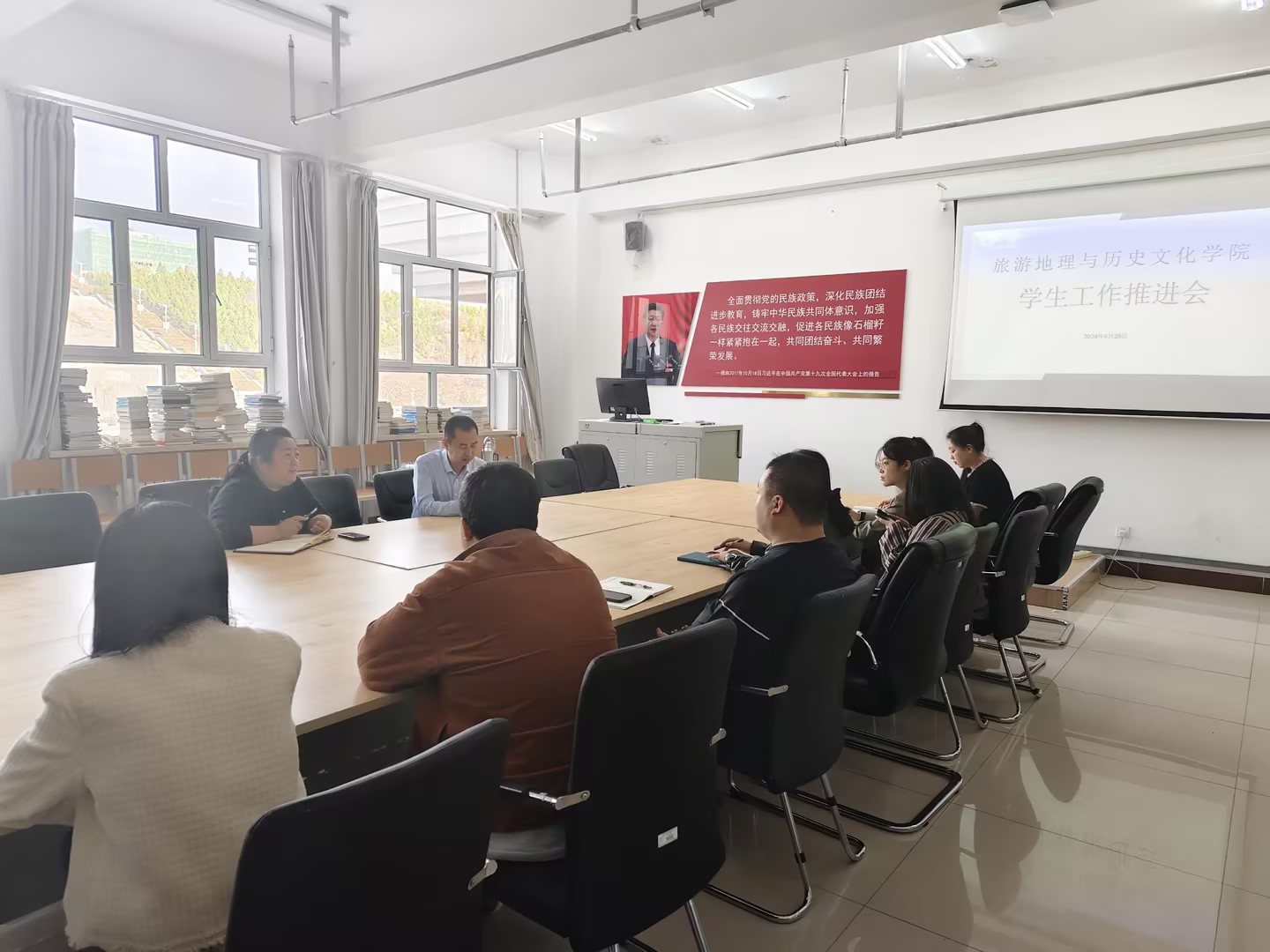 4月29日,旅游地理與歷史文化學院于崇文樓B307會議室開展五一假期學生工作會議,學院黨總支書記趙金輝、副書記王宏霞、團學辦主任張程喧及各年級輔導員參會。