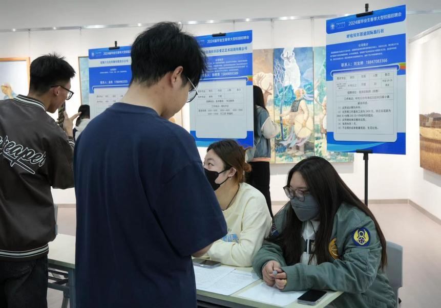 5月25日,美術學院召開2024屆畢業生校園招聘會,邀請了呼倫貝爾城畫美學文化傳播有限公司、內蒙古競游網絡科技有限責任公司、內蒙古恒訊實業有限責任公司、必優傳媒有限責任公司、愛藝美術培訓學校、呼倫貝爾景途國際旅行社、蒙騰力文化傳播有限公司等8家企業單位,帶來80余個招聘職位,涵蓋美術教育、攝影傳媒、平面設計、游戲設計等多個領域。