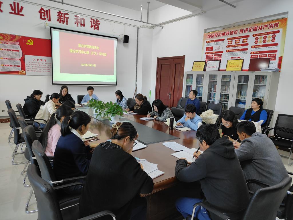 10月16日下午,在崇文樓B221會議室,蒙古學學院召開黨總支理論學習中心組(擴大)學習會。學習會由學院黨總支書記格根塔娜主持,學院黨總支理論學習中心組成員及全體教職工參加。