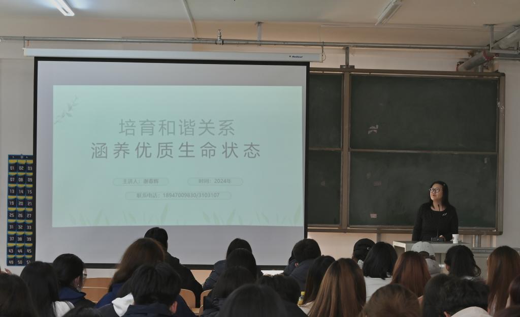 講座伊始,謝春輝闡述了和諧關系在個體生命狀態中的重要性。她指出,良好的人際關系不僅是社會和諧的基礎,更是個人幸福感和生活質量的關鍵所在。隨后,結合心理學理論和實際案例,深入淺出地講解了如何鑒別并處理人際關系中的常見問題,如溝通障礙、信任缺失、情緒沖突等。在講座的高潮部分,她分享了一系列實用的方法和技巧,幫助同學們提升人際交往能力,從而培育出更加和諧的關系。此外,謝春輝還特別提到了涵養優質生命狀態的重要性。她認為,一個優質的生命狀態不僅體現在身體健康上,還包括心理健康和社交健康。因此,她鼓勵同學們在日常生活中注重自我關懷,培養積極的生活態度,通過運動、閱讀、冥想等方式來放松身心,提升自我修養。
