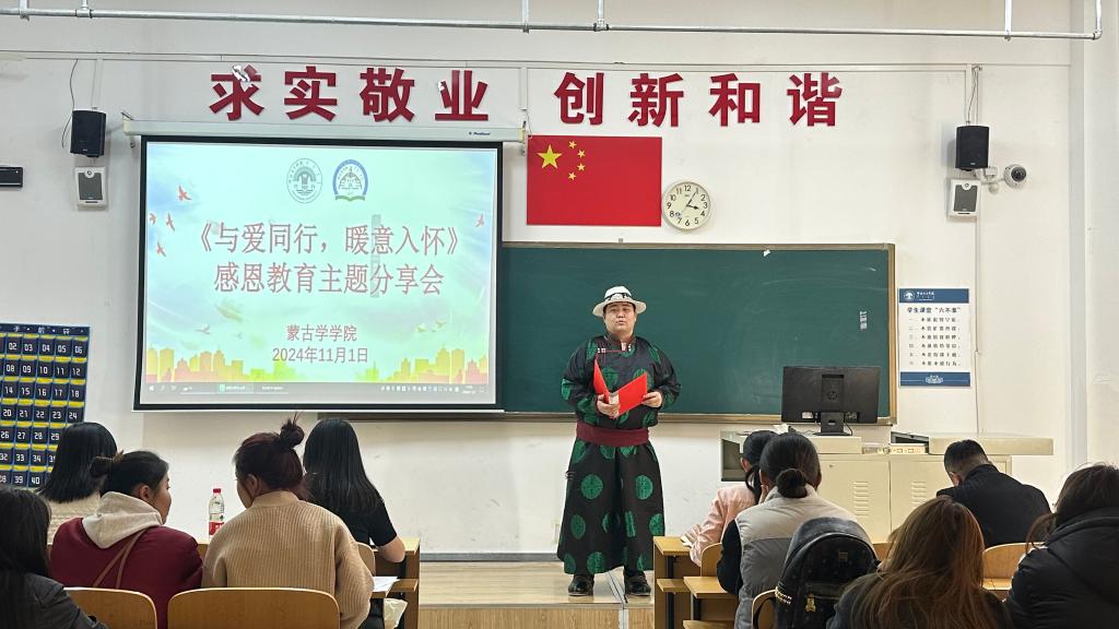 為了加強學生的感恩教育,培養學生的社會責任感和良好道德品質,樹立良好的典范,11月2日下午,蒙古學學院在崇文樓B206教室舉辦“與愛同行,暖意入懷”感恩教育主題分享會。學院黨總支書記格根塔娜、副書記孔春艷,團學辦老師和全體受各類獎助學金學生參加了會議。學生坦黑拉主持分享會。