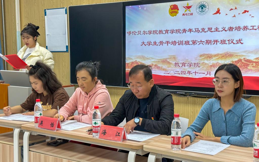 為進一步在廣大團員和青年中開展學習貫徹習近平總書記關于青年工作的重要思想,培養一批有忠誠政治品格、濃厚家國情懷、扎實理論功底、突出能力素質的新時代青年馬克思主義者,教育學院于11月5日下午,在藝術樓503智慧教室舉行教育學院青年馬克思主義者培養工程大學生骨干培訓班第六期開班儀式。學院黨總支書記海江、副書記吳怡,學生黨支部書記薩仁圖亞、團學辦主任張晶和第六期全體新學員參加儀式。學院學生黨支部副書記張雪瑩主持儀式。