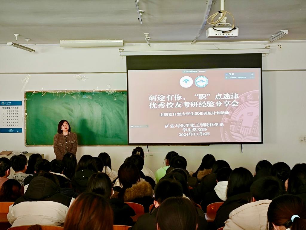 為進(jìn)一步助力同學(xué)們明確學(xué)習(xí)方向,提前做好學(xué)業(yè)、職業(yè)規(guī)劃,礦業(yè)與化學(xué)化工學(xué)院學(xué)生黨支部聯(lián)合化學(xué)系于11月6日在科技樓323教室舉辦“研途有你,‘職’點迷津”優(yōu)秀校友考研經(jīng)驗分享主題黨日暨大學(xué)生就業(yè)引航計劃活動。學(xué)院黨總支書記張陽、學(xué)生黨支部書記孟慶永、化學(xué)系主任齊霞及2022級、2023級、2024級相關(guān)專業(yè)學(xué)生共計170余人參加了活動,邀請了3名2022屆優(yōu)秀校友在線上交流分享考研經(jīng)驗和心得,活動由齊霞主持。