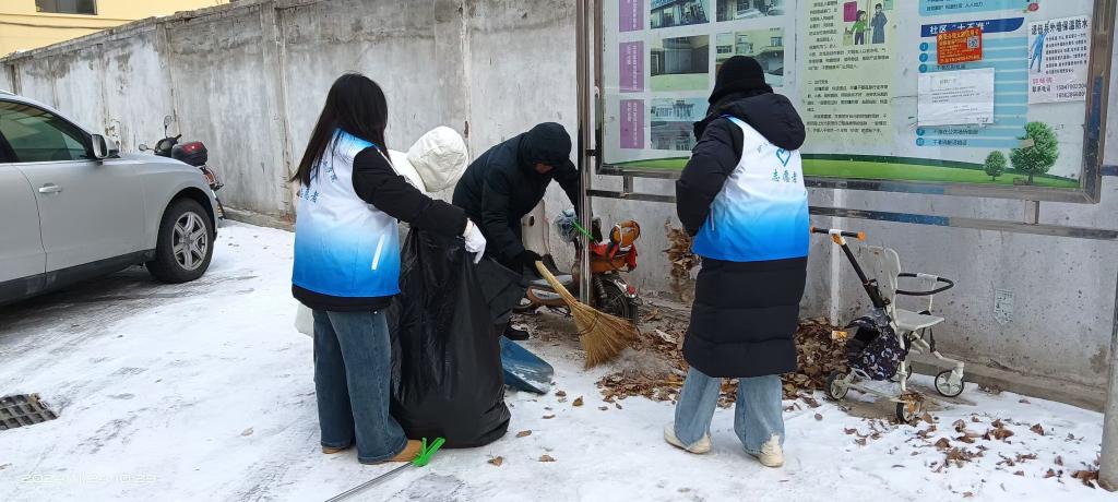 活動中,大家踏著白雪,抵著寒風,仔仔細細地清掃每一處,不論是電瓶車下的落葉,還是告示欄下的垃圾,都用掃帚和夾子一一除凈,大家認真清理小區內外地面垃圾、樹葉和雜草,爭取不讓一片落葉留在這美麗的家園中。