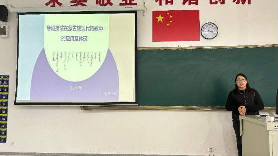 活動中,烏云斯琴作了題為《繪畫技法在蒙古族現代詩歌中的應用及體現》的講座。她主要聚焦于蒙古族現代詩歌中色彩的搭配與構圖方法兩大方面,深入探討了繪畫技法如何融入蒙古族現代詩歌的創作中。在色彩搭配的部分,她詳細解析了基礎色的運用以及色彩的對比使用兩大策略。至于蒙古族現代詩歌的構圖方法,她從聚焦法、散點法、透視法三個維度進行了全面闡述。