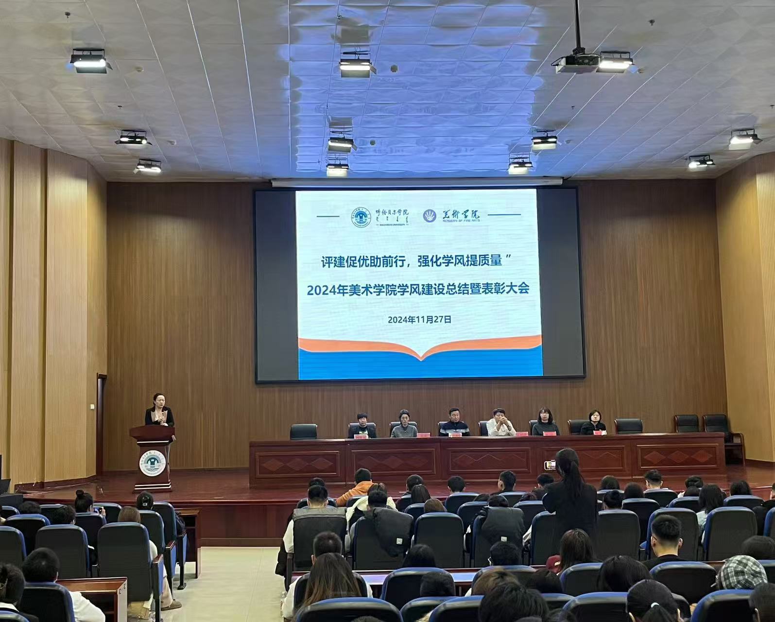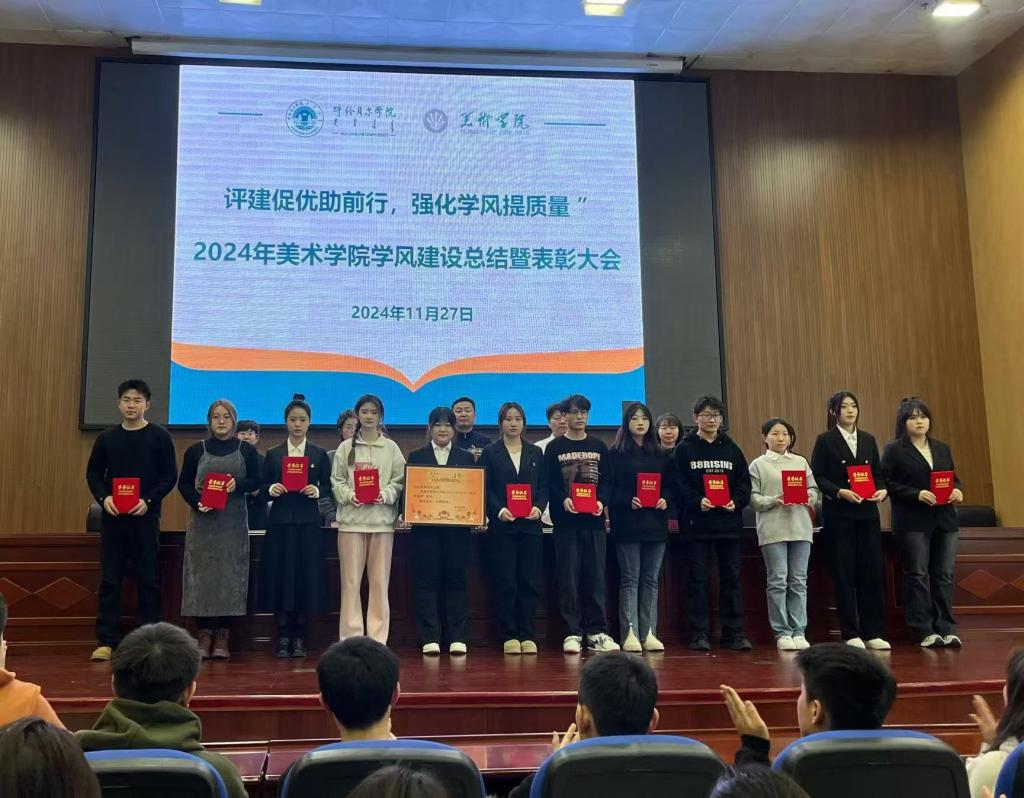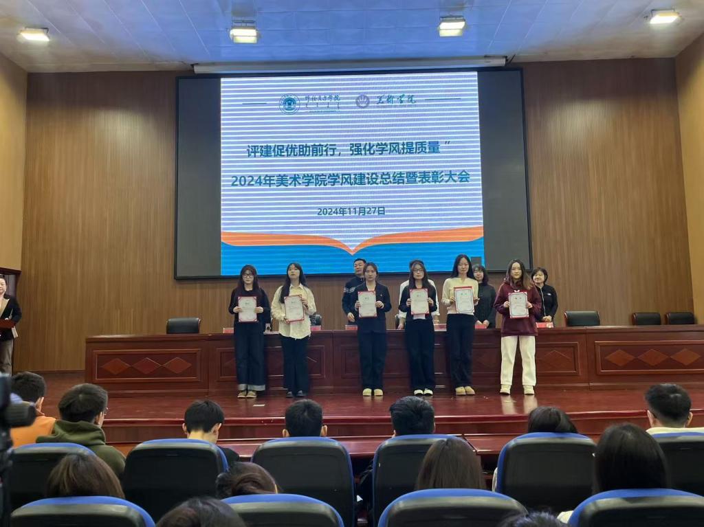 2024年,美術(shù)學(xué)院以習(xí)近平新時(shí)代中國(guó)特色社會(huì)主義思想為指導(dǎo),以鑄牢中華民族共同體意識(shí)為主線,全面貫徹落實(shí)黨的教育方針,圍繞立德樹(shù)人根本任務(wù),堅(jiān)持“以評(píng)促建、以評(píng)促改、以評(píng)促管、以評(píng)促?gòu)?qiáng)”,突出內(nèi)涵發(fā)展、特色發(fā)展與創(chuàng)新發(fā)展,挖掘出了眾多優(yōu)秀的成果與經(jīng)驗(yàn),美術(shù)學(xué)院于11月27日在圖書(shū)館四樓報(bào)告廳召開(kāi)“評(píng)建促優(yōu)助前行,強(qiáng)化學(xué)風(fēng)提質(zhì)量”學(xué)風(fēng)建設(shè)總結(jié)暨表彰大會(huì)。美術(shù)學(xué)院領(lǐng)導(dǎo)班子成員、各系主任、團(tuán)學(xué)辦全體成員及各年級(jí)學(xué)生等四百余人參加了會(huì)議。