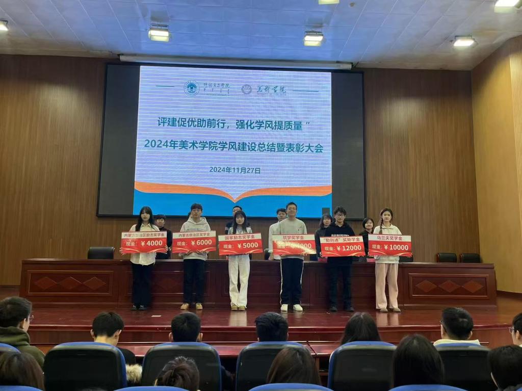 大會(huì)在莊嚴(yán)的國(guó)歌中拉開(kāi)序幕,首先宣讀了2024年學(xué)生工作中各類(lèi)獎(jiǎng)項(xiàng)獲獎(jiǎng)名單及烏蘭夫獎(jiǎng)學(xué)金、“勤則通”獎(jiǎng)助學(xué)金、筑夢(mèng)獎(jiǎng)學(xué)金、國(guó)家勵(lì)志獎(jiǎng)學(xué)金、自治區(qū)獎(jiǎng)學(xué)金、自治區(qū)勵(lì)志獎(jiǎng)學(xué)金、呼倫貝爾學(xué)院十佳大學(xué)生名單。表彰了美術(shù)學(xué)院2024年大學(xué)生返家鄉(xiāng)暨三下鄉(xiāng)社會(huì)實(shí)踐優(yōu)秀志愿者和美術(shù)學(xué)院優(yōu)秀學(xué)生干部。學(xué)院對(duì)各獲獎(jiǎng)個(gè)人和集體頒發(fā)證書(shū)并予以表彰。團(tuán)總支、學(xué)生會(huì)作全年工作總結(jié),優(yōu)秀學(xué)生代表、優(yōu)秀班集體代表、優(yōu)秀學(xué)生干部代表作大會(huì)典型發(fā)言,并分享工作學(xué)習(xí)經(jīng)驗(yàn),交流心得體會(huì)。