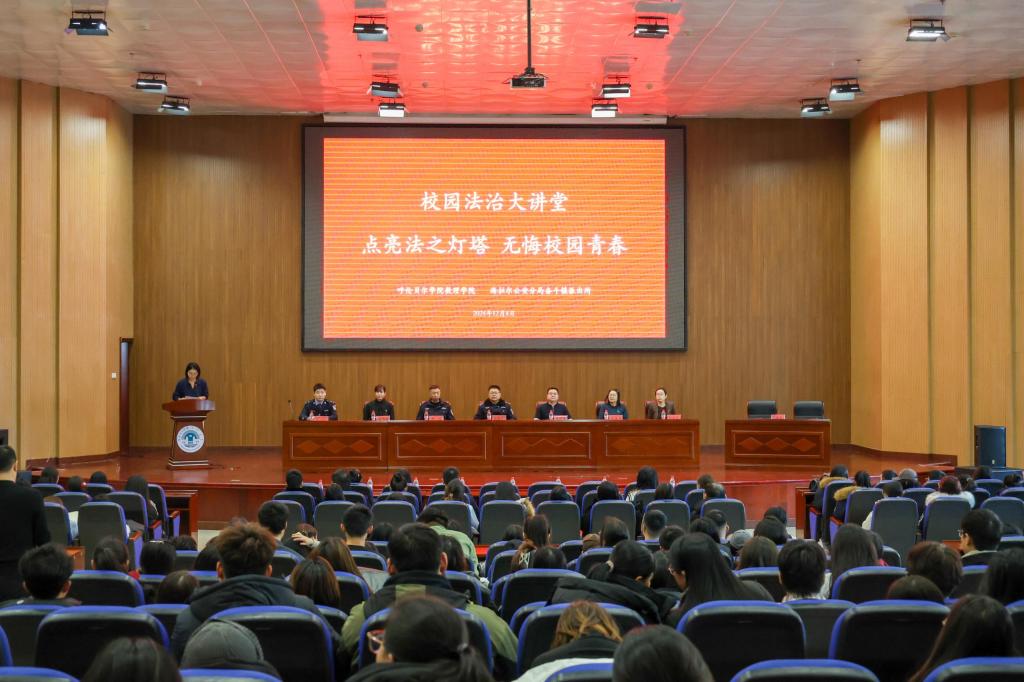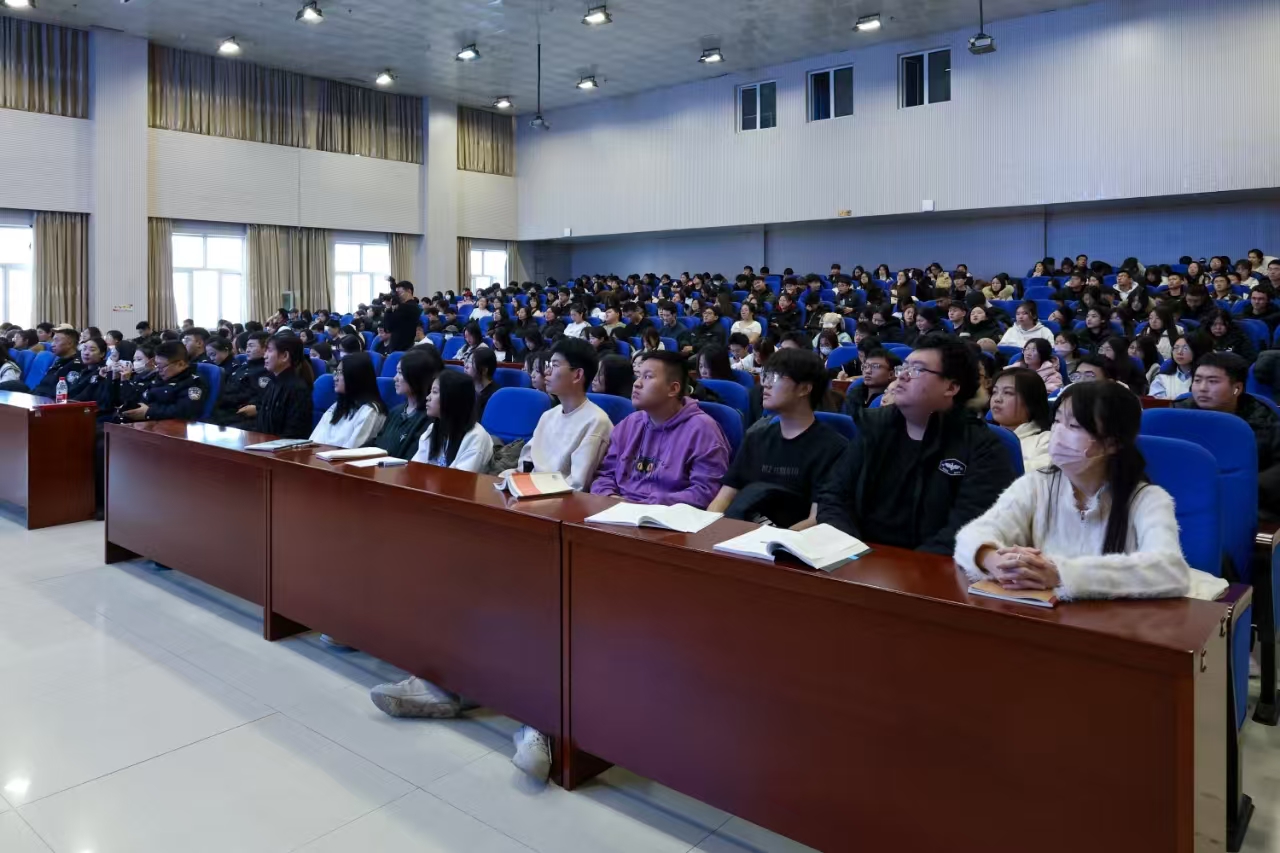 12月4日下午,數理學院聯合海拉爾公安分局奮斗鎮派出所在圖書館四樓報告廳組織開展了校園法治大講堂活動。海拉爾公安分局機關黨委副書記尹強、海拉爾公安分局奮斗鎮派出所教導員劉德勇、警官劉洋,學校校園安全管理處處長王利國,學生工作處(黨委學生工作部、武裝部)副處長謝春輝,數理學院黨總支書記楊巧智、副書記烏日拉以及奮斗鎮派出所民警、師生代表等400余人參加了活動。