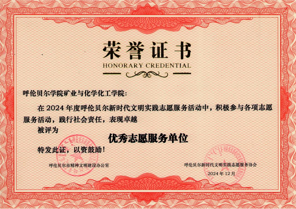 為響應時代號召,以實際行動踐行社會主義核心價值觀,弘揚新風尚,傳遞正能量,助力呼倫貝爾市社會、經濟和文化蓬勃發展,礦業與化學化工學院在2024年初與呼倫貝爾新時代文明實踐志愿服務協會簽訂了合作協議,并積極參加協會組織的志愿服務活動,因表現卓越,礦業與化學化工學院被評選為2024年度呼倫貝爾新時代文明實踐志愿服務活動“優秀志愿服務單位”殊榮。