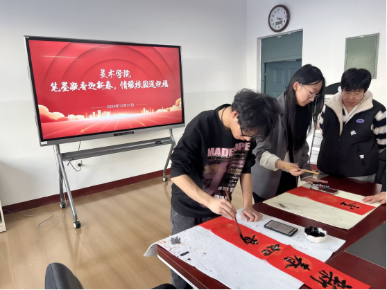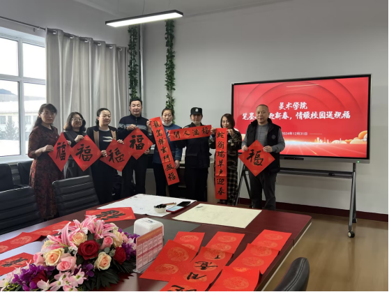 12月31日,美術學院黨總支書記巴達日呼、院長何錫彭、黨總支副書記張巍巍帶領教工黨員及學生,在學院309會議室開展以“筆墨情深迎新春,情暖校園送祝福”為題的主題黨日,為保安、保潔和宿管群體送上了真摯的新春祝福,讓這個冬日充滿溫情。