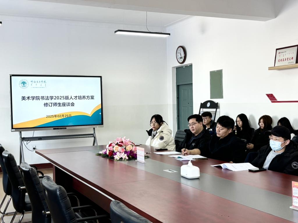 2月25日,美術學院在尚行樓會議室召開書法學2025版人才培養方案修訂師生座談會。書法系主任張明星,教師楊文賓、劉佳、張昊及書法系全體學生共同參加會議。此次座談會旨在廣泛聽取師生意見,進一步優化人才培養方案,提升書法學專業人才培養質量。