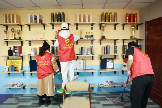在活動中,大家身著統一紅色服裝,到達活動現場后,同學們熱情高漲,迅速分工,投入到緊張而有序的服務工作中。同學們拿起掃帚、拖把和抹布,認真清理地面上的灰塵與污漬,細心擦拭乒乓球桌、座椅和器材,每一個角落都不放過,汗水浸濕了他們的額頭,卻澆不滅大家心中志愿服務的熱忱。