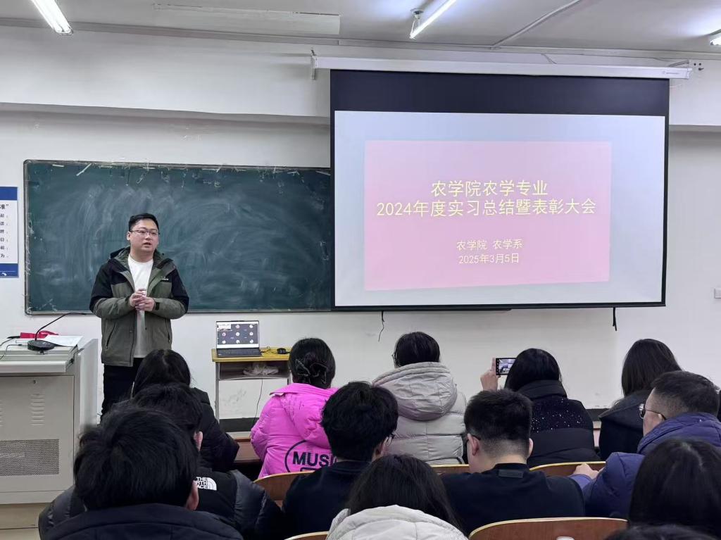3月5日晚,農學院農學系在科技樓323教室召開2024年度實習總結暨表彰大會。本次會議采用線上線下相結合的方式,農學系全體教師、2022級農學班全體學生現場參會,2021級農學班學生以線上方式同步參與了此次大會。本次會議由2022級農學班學生王詩宇主持。