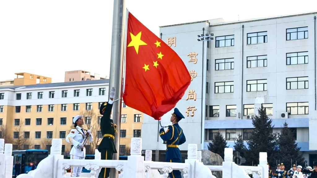 呼倫貝爾學院國防教育實踐團國旗護衛隊身著戎裝,步伐鏗鏘有力,護衛著五星紅旗走向升旗臺。在全體師生的注目禮中,伴隨著激昂的《義勇軍進行曲》,國旗冉冉升起,全體師生莊嚴肅立,共唱國歌,表達對偉大祖國的崇高敬意。