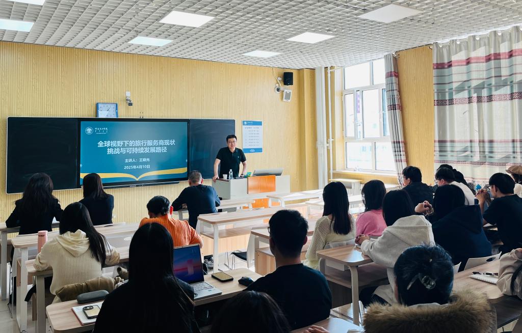 為助力學(xué)生更好地了解旅游行業(yè)現(xiàn)狀,明晰職業(yè)發(fā)展方向,4月10日下午,旅游地理與歷史文化學(xué)院邀請呼倫貝爾易游國際旅行社有限公司董事長、旅游管理專業(yè)碩士研究生行業(yè)導(dǎo)師王曉光在崇文樓B402教室作題為《全球視野下的旅行服務(wù)商現(xiàn)狀挑戰(zhàn)與可持續(xù)發(fā)展路徑》專題講座。此次講座是“愛旅游”學(xué)術(shù)論壇——行業(yè)專家進(jìn)校園的第五場講座。學(xué)院黨總支書記趙金輝、副院長徐舒靜、旅游管理碩士點(diǎn)負(fù)責(zé)人亞吉、碩士研究生導(dǎo)師和研究生辦公室工作人員以及2024級旅游管理研究生、2021級本科生共同聆聽講座。講座由徐舒靜主持。