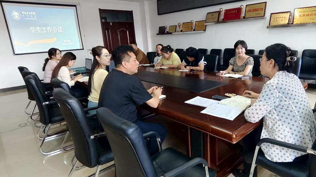 會(huì)上,郭晶對(duì)假期審核評(píng)估學(xué)生發(fā)展相關(guān)材料梳理、檔案完善、學(xué)生實(shí)習(xí)管理、留校學(xué)生管理、畢業(yè)生就業(yè)統(tǒng)計(jì)等相關(guān)工作進(jìn)行了總結(jié)。隨后,她傳達(dá)了學(xué)校2025年秋季學(xué)期開學(xué)校園安全穩(wěn)定工作暨學(xué)生工作會(huì)議精神,并對(duì)校園安全、學(xué)生教育管理、輔導(dǎo)員隊(duì)伍建設(shè)等工作任務(wù)進(jìn)行具體安排。對(duì)近期的迎新和就業(yè)工作,她強(qiáng)調(diào):要按照學(xué)校部署和要求,認(rèn)真做好新生聯(lián)系、答疑解惑、接待、保險(xiǎn)、家長(zhǎng)會(huì)、宿舍安排、軍訓(xùn)、入學(xué)教育等各項(xiàng)工作任務(wù);要在2025屆畢業(yè)生就業(yè)工作沖刺階段,繼續(xù)做好2025屆畢業(yè)生就業(yè)的動(dòng)員、核查和統(tǒng)計(jì)工作,更要承上啟下,提前謀劃部署2026屆畢業(yè)生就業(yè)工作。