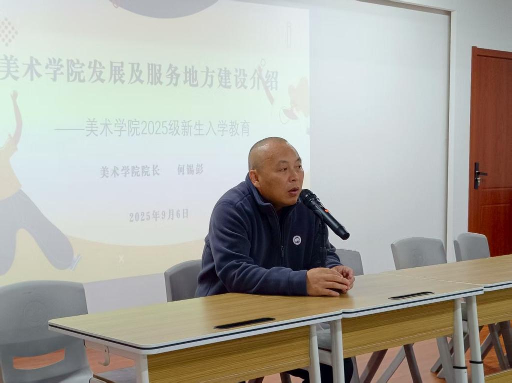 何錫彭首先向全體新生表示歡迎,并勉勵(lì)學(xué)子以大學(xué)為起點(diǎn),在藝術(shù)探索中實(shí)現(xiàn)自我突破。隨后,他系統(tǒng)梳理了美術(shù)學(xué)院自建院以來(lái)的輝煌歷程,從藝術(shù)創(chuàng)作到教學(xué)科研,從文化傳播到社會(huì)服務(wù),學(xué)院以“傳承與創(chuàng)新交融、藝術(shù)與實(shí)踐共生”為理念,培育出大批兼具人文底蘊(yùn)與時(shí)代擔(dān)當(dāng)?shù)乃囆g(shù)人才。結(jié)合鮮活案例,何錫彭著重闡述了學(xué)院師生服務(wù)地方的實(shí)踐成果:參與城市公共空間藝術(shù)改造,為街道注入美學(xué)活力;助力文化遺產(chǎn)保護(hù),讓傳統(tǒng)技藝煥發(fā)新生;扎根鄉(xiāng)村開(kāi)展墻繪創(chuàng)作,賦能鄉(xiāng)村振興文化內(nèi)涵。他還深入介紹了學(xué)院在產(chǎn)教融合、師資優(yōu)化、就業(yè)創(chuàng)業(yè)等方面的創(chuàng)新舉措,鼓勵(lì)新生立足專(zhuān)業(yè)所長(zhǎng),將藝術(shù)理想融入國(guó)家戰(zhàn)略與地方需求,以畫(huà)筆為媒介回應(yīng)時(shí)代命題。