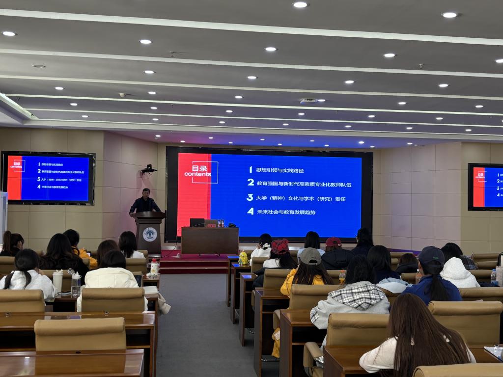 當天下午,王建平在崇文樓A201會議室為學前教育專業本科生帶來了一場主題為“新時代政策、理論與實踐——教育強國與教育家精神”的專題講座。2023級學前教育專業本科生到場聆聽。王建平以深厚的學術功底和豐富的實踐經驗,圍繞講座和交流主題,從“思想引領與實踐路徑”切入,通過數據對比和政策文本解讀,清晰梳理了教育領域的發展脈絡;結合大量鮮活的教育案例,深入剖析了“教育強國與新時代高素質專業化教師隊伍”“大學(精神)文化與學術(研究)責任”。最后,針對學生普遍關注的專業學習與未來發展問題,他分享了自己的學術經歷,并鼓勵同學們要“扎根教育理論、關注教育現實、培養創新思維”。