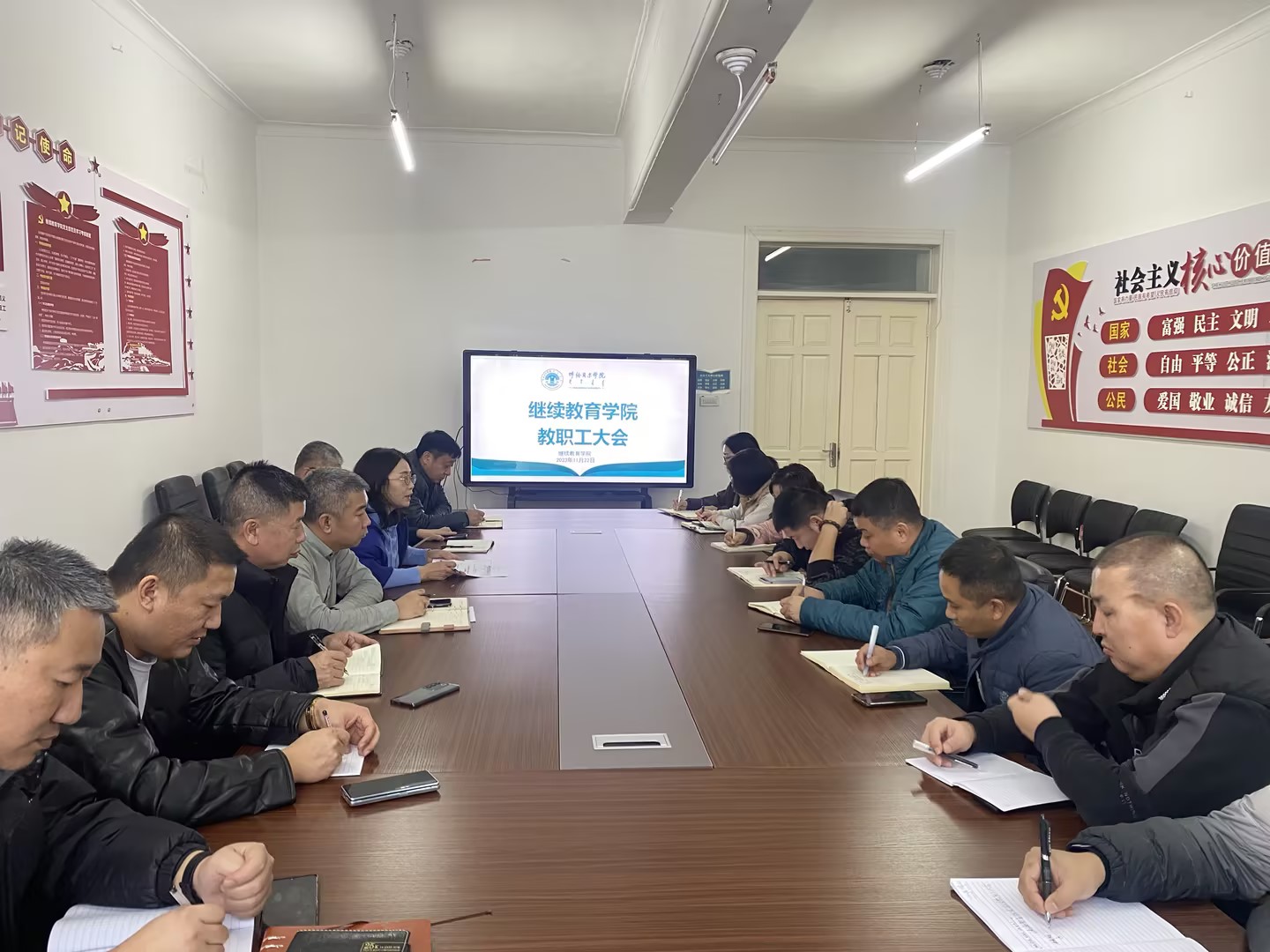 11月22日下午,繼續教育學院教職工大會在209會議室召開。學院黨政領導和全體教職工參加大會,會議由院長莎茹莉主持。