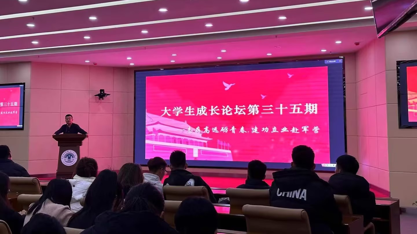 11月23日,學生工作處在崇文樓A 201會議室舉辦第三十五期大學生成長論壇。本期成長論壇結合全校征兵宣傳工作,邀請退伍軍人代表朱泓霖和李浩田兩位學生主講。學生工作處處長郝新君以及各個學院想參軍的學生參加了講座。