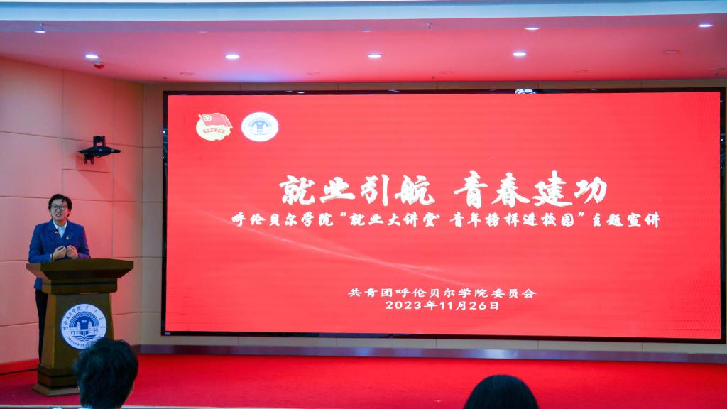 活動邀請到了3位在科技創新、鄉村振興、綠色發展、社會服務、衛國戍邊等領域努力奮斗的優秀青年代表,走進學校、面向青年講述個人就業選擇和奮斗故事,引導廣大青年學生積極在強國建設、民族復興偉業中挺膺擔當。呼倫貝爾市海拉爾區伊敏小學副校長張海霞結合個人成長經歷和奮斗故事進行了宣講,勉勵在校生做好人生規劃,腳踏實地走好每一步。天津市消防救援總隊信息化辦公室工程師、三級指揮長解傳鑫將自身專業發展與目前消防工作崗位相結合進行了宣講,鼓勵在校生無畏困難、永不言棄,不斷學習,勇于追夢。呼倫貝爾環保志愿者協會會長代守揚作為第十一屆母親河獎“綠色項目獎”獲獎人,結合自身在綠色發展和志愿服務領域的個人就業選擇和奮斗故事展開宣講,鼓勵在校生積極投身志愿服務,共同建設美麗中國。