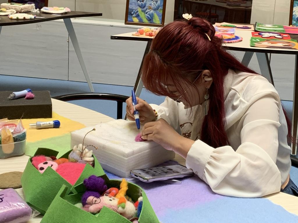 展覽共展出學(xué)生作品200余件,其中,教育學(xué)院精心制作的羊毛氈作品43件、太陽花作品48件、樺樹皮作品9件、民族頭飾13件、耳飾27對、手鏈11件以及剪紙作品23幅;美術(shù)學(xué)院參展作品共計36件,其中版畫作品6件、水彩作品12件、非遺文創(chuàng)產(chǎn)品10件、羊毛圍巾4件、羊毛氈包4件;音樂與舞蹈學(xué)院展出陶藝作品1件。此次展出的作品不僅數(shù)量多、質(zhì)量高,而且制作精致、惟妙惟肖,充分展現(xiàn)了民族文化的博大精深和中華傳統(tǒng)紙藝、陶藝、編織、刺繡、版畫、水彩畫等非遺文創(chuàng)作品的獨特魅力。