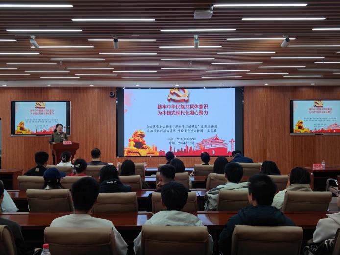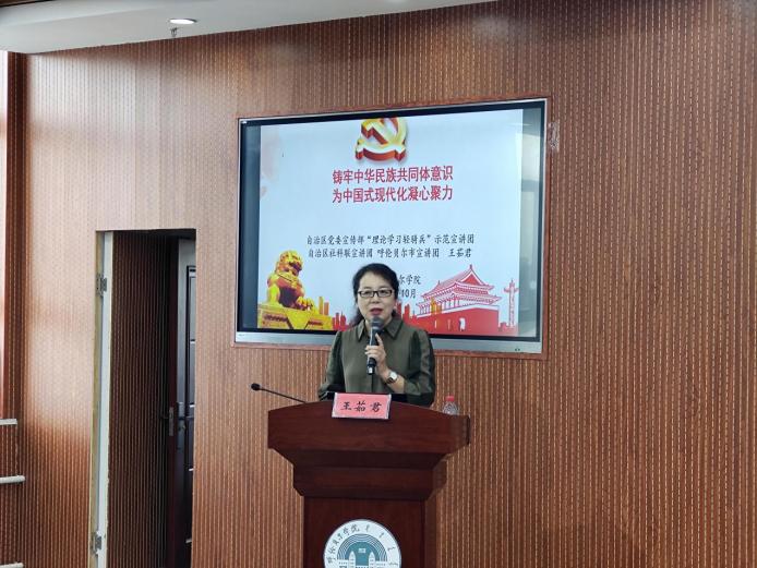 講座上,呼倫貝爾市社科聯副主席王茹君以《鑄牢中華民族共同體意識 為中國式現代化凝心聚力》為題,從中華民族共同體意識的提出過程和主要含義、中華民族共同體意識提出的重大意義、鑄牢中華民族共同體意識是做好新時代民族工作的主線、歷次中央民族工作會議和鑄牢中華民族共同體意識、為中國式現代化凝心聚力等五個方面進行了深刻闡述和解讀。